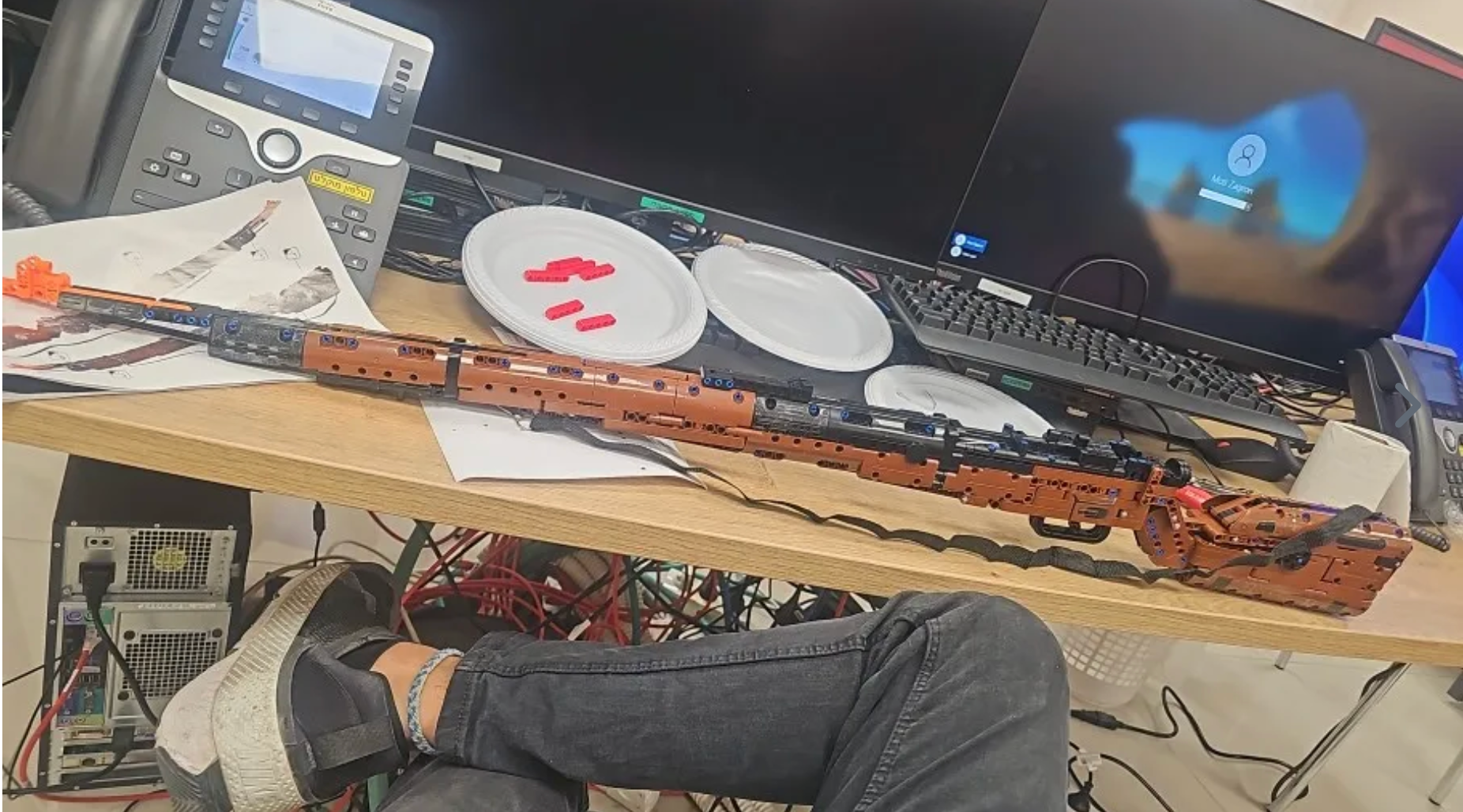 Yes, this buildable set features a shooting mechanism that ejects small, lightweight plastic projectiles.